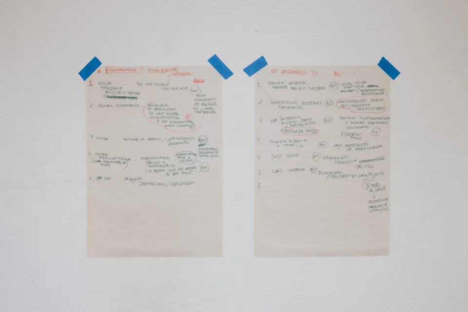 Projekt rezydencji zespołu Miry Mańki i Filipa Jaśkiewicza dotyczący codzienności inspirowany był Szczelinami istnienia Jolanty Brach-Czainy. To właśnie książka, uznana przez nich za „filozoficzne ćwiczenie z uważności” i „postulat osunięcia się z gładkiej powierzchni oczywistości w mrok, w szczelinę, w pęknięcie”, stała się impulsem do myślenia o codzienności jako przestrzeni „eskapistycznego buntu” i związaną z nim potrzebą „tworzenia opowieści o niespektakularnych «małych życiach» i ich nieodkrytym potencjale”. Z inspiracji esejem Brach-Czainy powstały narzędzia doświadczania codzienności, które na pierwszym spotkaniu feedbackowym zostały wypróbowane przez osoby uczestniczące. Twórczyni i twórca wykorzystali trzy tygodnie swojej pracy i trzy kolejne studio visits na rozpoznawanie możliwości badania i mówienia o codzienności, za każdym razem stawiając inne pytania i próbując uchwycić codzienność w innych jej aspektach. W czasie kolejnych studio visits nie tyle prezentowane było rozwinięcie rozpoznań z poprzedniego tygodnia, ile praca niejako zaczynała się na nowo, z użyciem innej metodologii i innymi narzędziami, by wypróbować jak najwięcej możliwości. Była to ze strony kolektywu świadoma i konsekwentnie realizowana strategia – Jaśkiewicz i Mańka formułowali swoje oczekiwania wobec rezydencji, zakładając, że pozwoli ona „uwolnić projekt od tradycyjnie rozumianego teatru i eksplorować inne strategie twórcze i narracyjne”. Uczestniczenie w rezydencji, w której proces pracy jest ważniejszy niż efekt, było dla nich istotne właśnie ze względu na zainteresowanie metodologią procesu pracy artystycznej oraz pragnienie od-uczenia się nabytych w szkołach artystycznych metod pracy i nauczenia się refleksyjnej pracy z dynamiką procesu. Jak mówili: 5My też wytwarzamy metodologie. Nie przychodzimy z gotowym modelem, ale będziemy testować te narzędzia i przyglądać się, co działa.