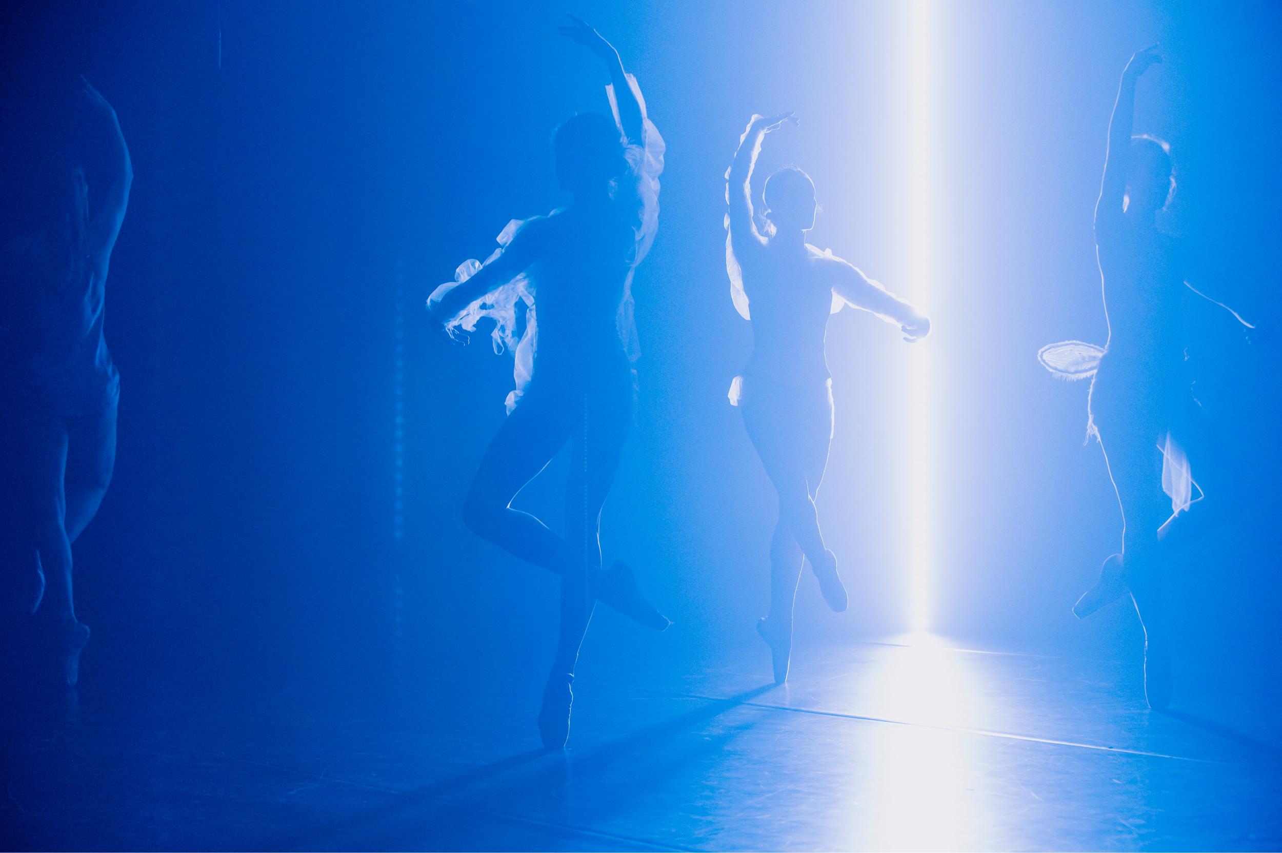 Cztery kobiety. Stoją w szeregu na pointach. Jedna z nich stoi bliżej, oświetlona przez reflektor. Ma na sobie krótki tiulowy kostium, we włosach ozdobę przypominjącą pióra.